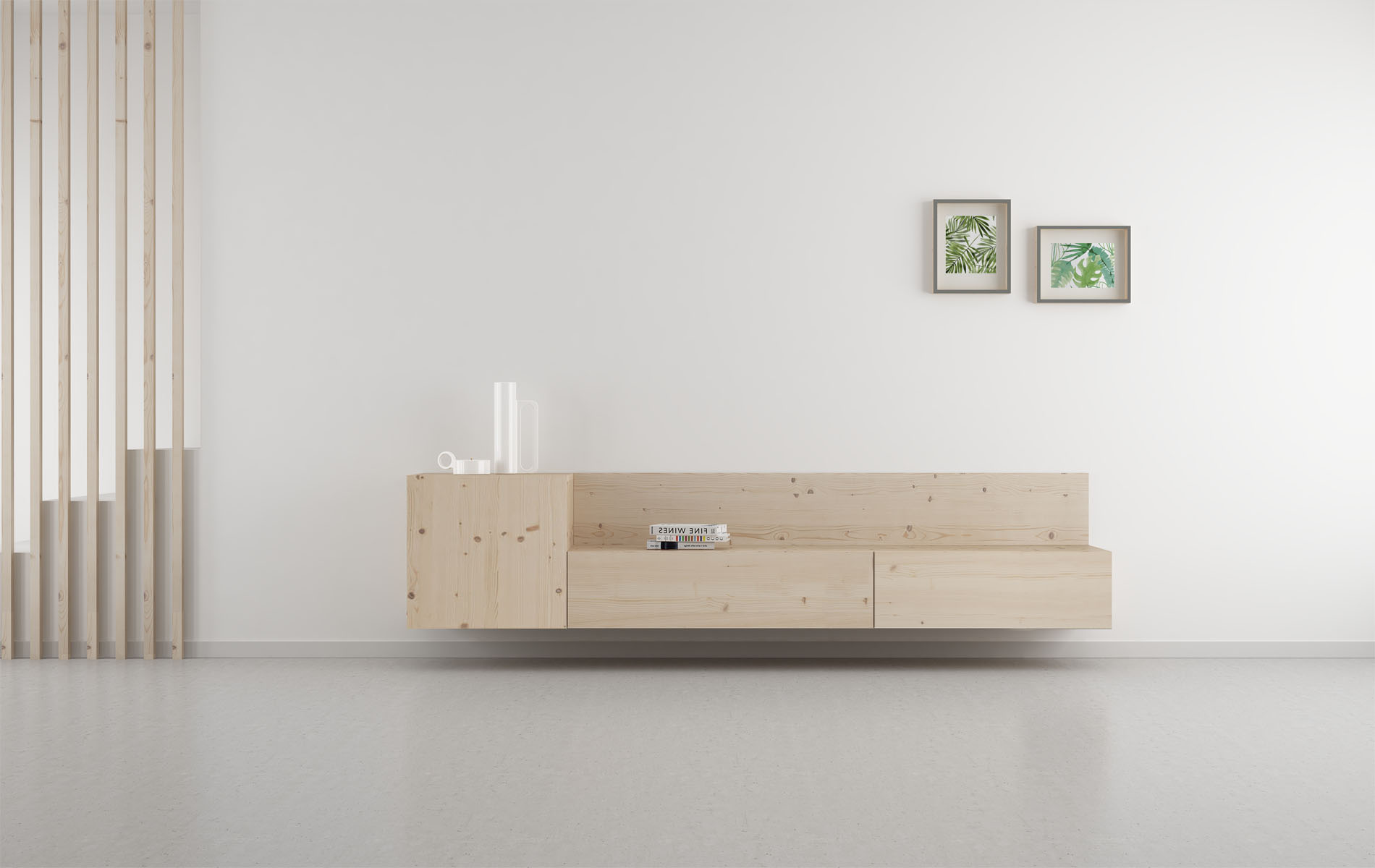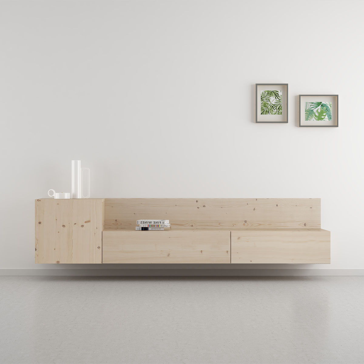 Composición salón a pared o patas suelo de diseño muy fresco. La naturalidad de la madera ofrece bienestar a tu hogar. Fabricado en madera maciza 100% certificada de explotaciones controladas (incluido bajo de cajones y traseras). Producto terminado con barnices al agua que respetan nuestro entorno, diseñados para espacios interiores, que cumplen límites estrictos de emisiones de COVs (compuestos orgánicos volátiles), a diferencia de los acabados convencionales. Color natural. Textura de madera con nudos que le dan carácter a la pieza y transmiten sensaciones de natural y cercano.